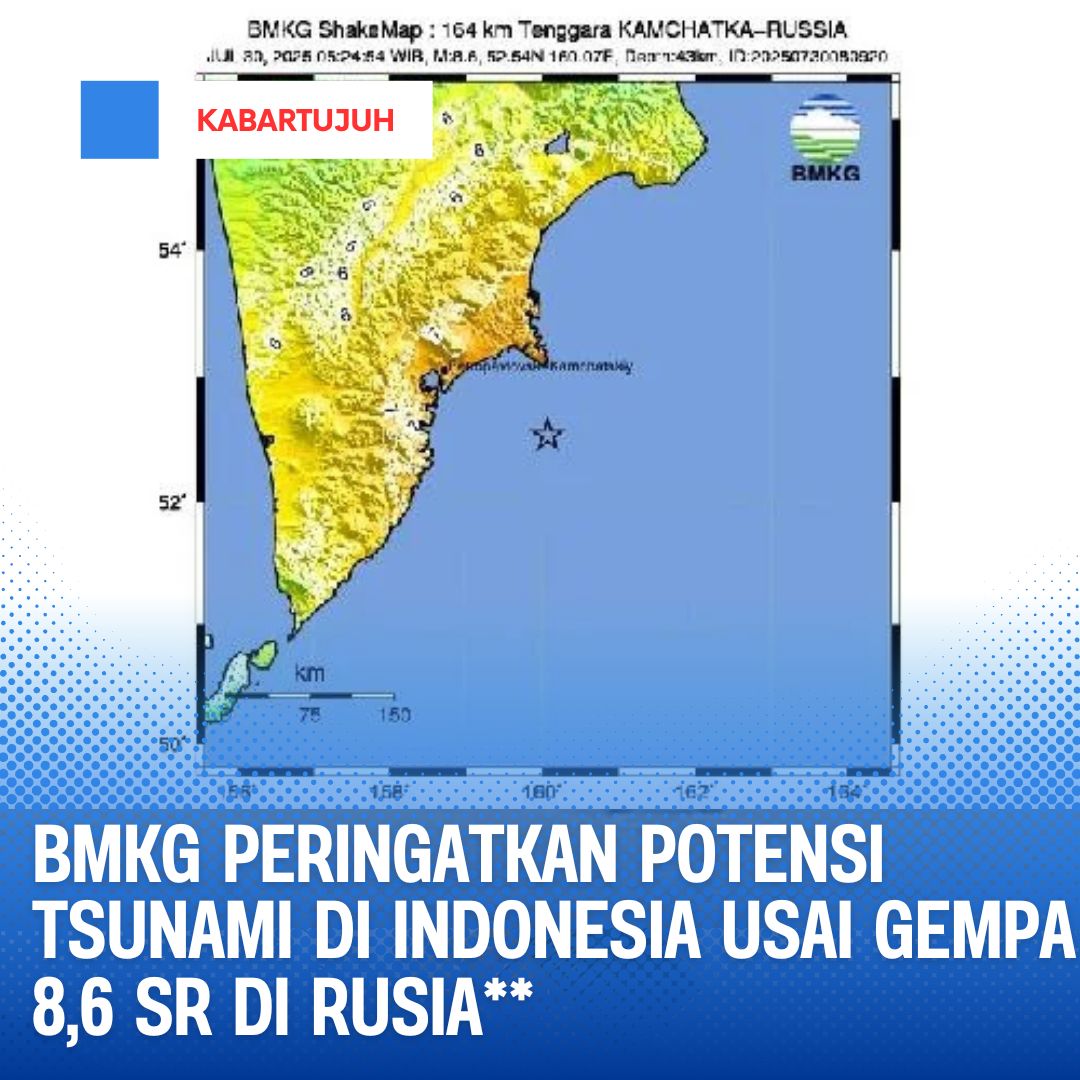 Badan Meteorologi, Klimatologi, dan Geofisika (BMKG) mengeluarkan peringatan dini tsunami di sejumlah wilayah Indonesia menyusul gempa bumi bermagnitudo 8,6 yang terjadi di Rusia, Rabu (30/7) pukul 06.24 WIB. Gempa tersebut berlokasi di 164 kilometer tenggara Kamchatka, Rusia.