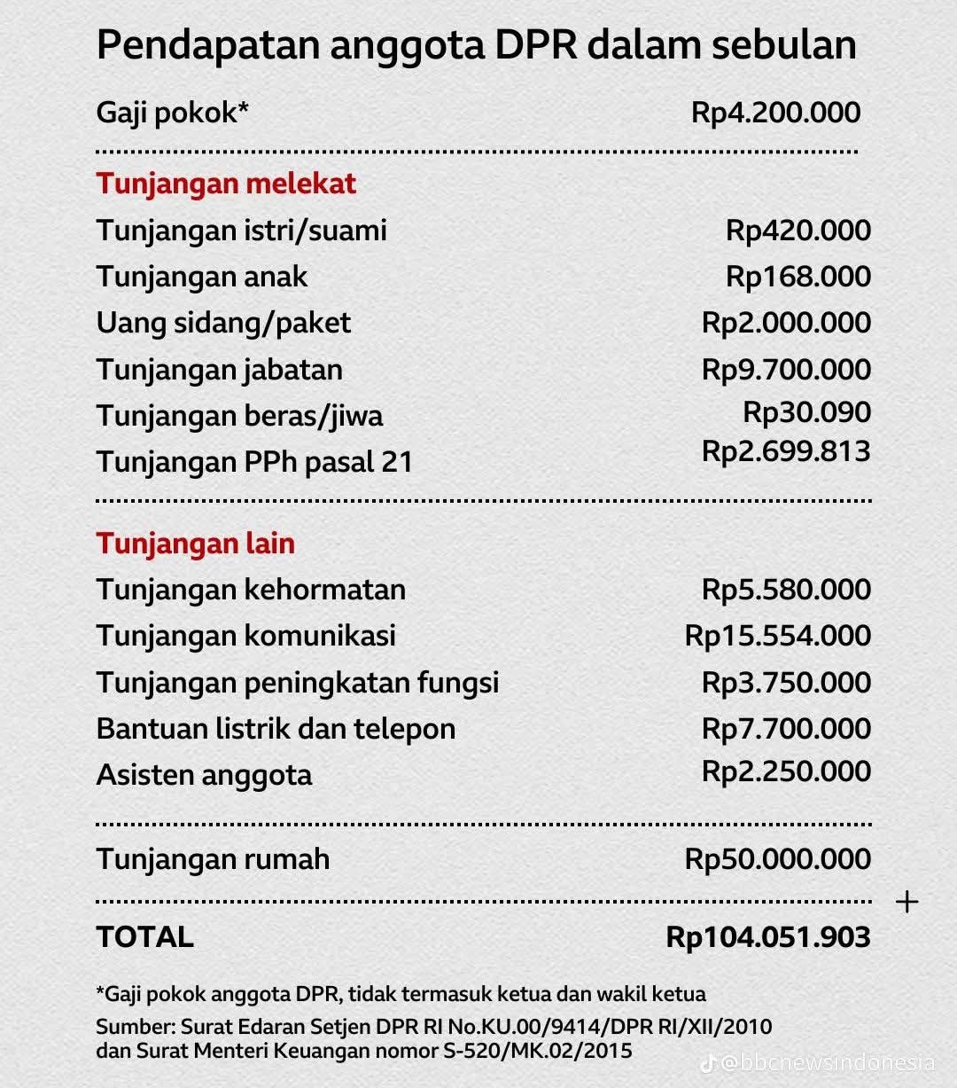 Dengan demikian, akumulasi seluruh komponen pendapatan membuat total yang diterima seorang anggota DPR menembus lebih dari Rp100 juta per bulan.