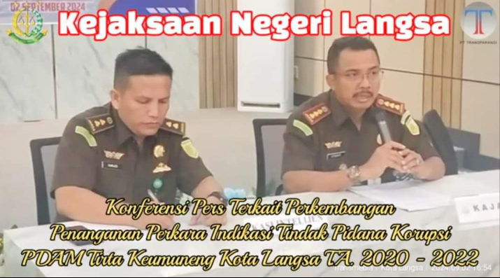 Mediaindonesia24.com,LANGSA,Aceh—-,Kepala Kejaksaan Negeri (Kajari) Langsa Efrianto, S.H., M.H. didampingi oleh Carles Aprianto, S.H., M.H. selaku Kepala seksi Intelijen, mengelar Press Release bertempat di Aula Meeting Room Kantor Kejari setempat Senin, 02 September 2024, terkait perkembangan penanganan Perkara Dugaan Tindak Pidana Korupsi dalam Pengelolaan Keuangan Terhadap Pengadaan Bahan Kimia Tawas Batu, pada PDAM Tirta Keumueneng Kota Langsa Tahun Anggaran 2020 s/d 2022 dan berdasarkan Surat Perintah Penyidikan Kepala Kejaksaan Negeri Langsa Nomor: Print-02/L.1.13/Fd.1/10/2023 tanggal 30 Oktober 2023,