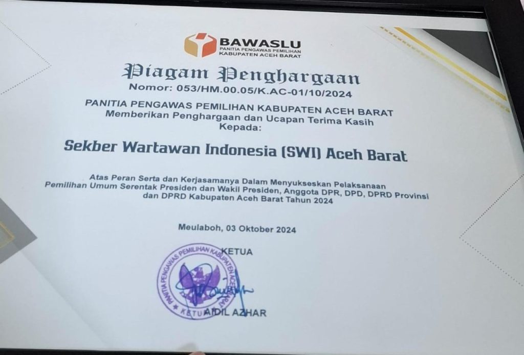Aceh Barat: Badan Pengawas Pemilu (Bawaslu) Republik Indonesia, melalui Bawaslu Kabupaten Aceh Barat menyerahkan Reward kepada Dewan Pengurus Daerah (DPD) Sekber Wartawan Indonesia (SWI) Kabupaten Setempat, Kamis (03/10/2024).