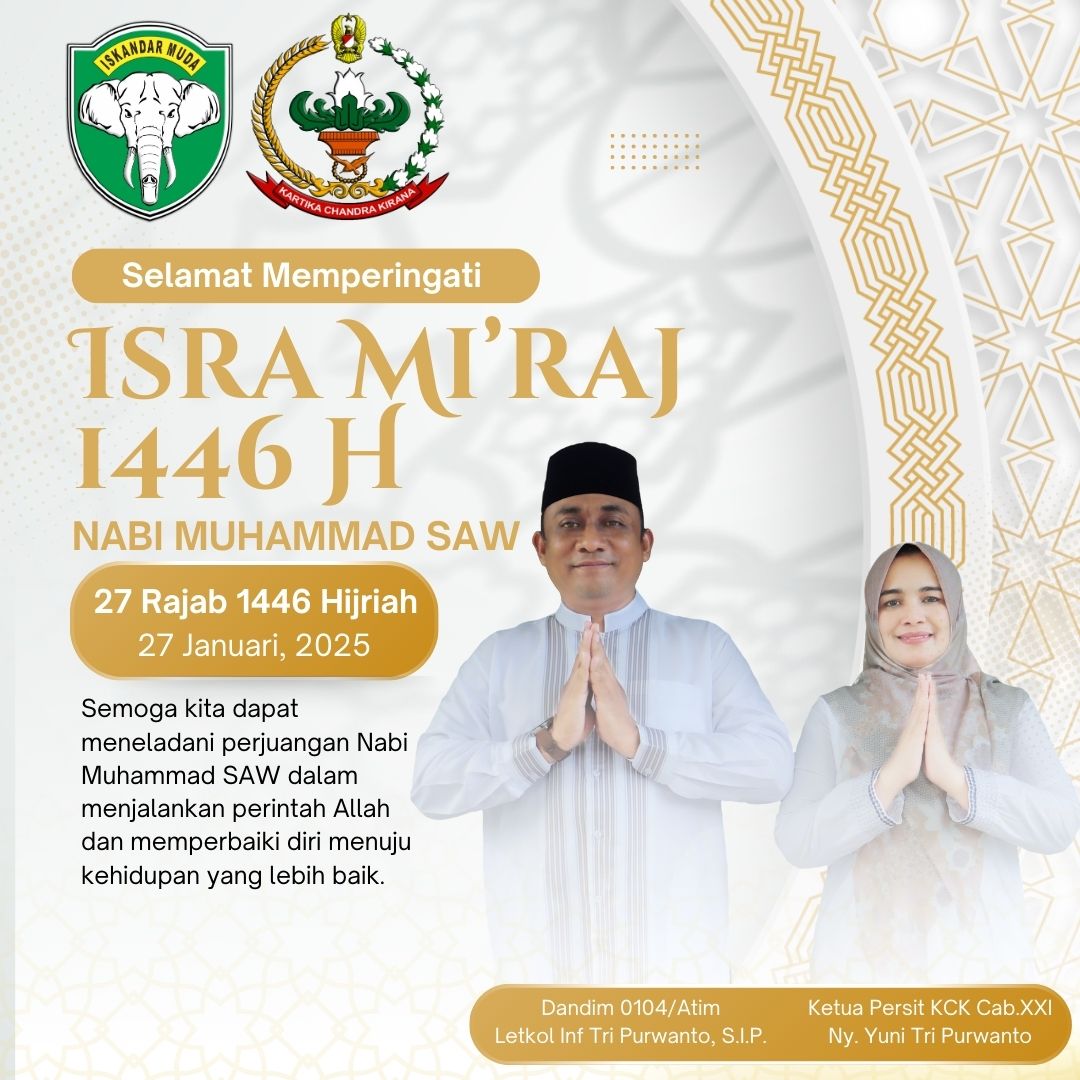 Mediaindonesia24.com,Aceh Timur——Senin (27 Januari 2025) – Dalam rangka memperingati Isra Mi’raj Nabi Muhammad SAW 1446 H / 2025 M, Dandim 0104/Aceh Timur, Letkol Inf Tri Purwanto, S.I.P., bersama Ketua Persit Kartika Chandra Kirana (KCK) Cabang XXI Dim 0104 Koorcab Rem 011 PD Iskandar Muda, Ny. Yuni Tri Purwanto, menyampaikan ucapan penuh makna melalui sebuah kolase gambar yang diposting di media sosial dan berbagai platform media online.
