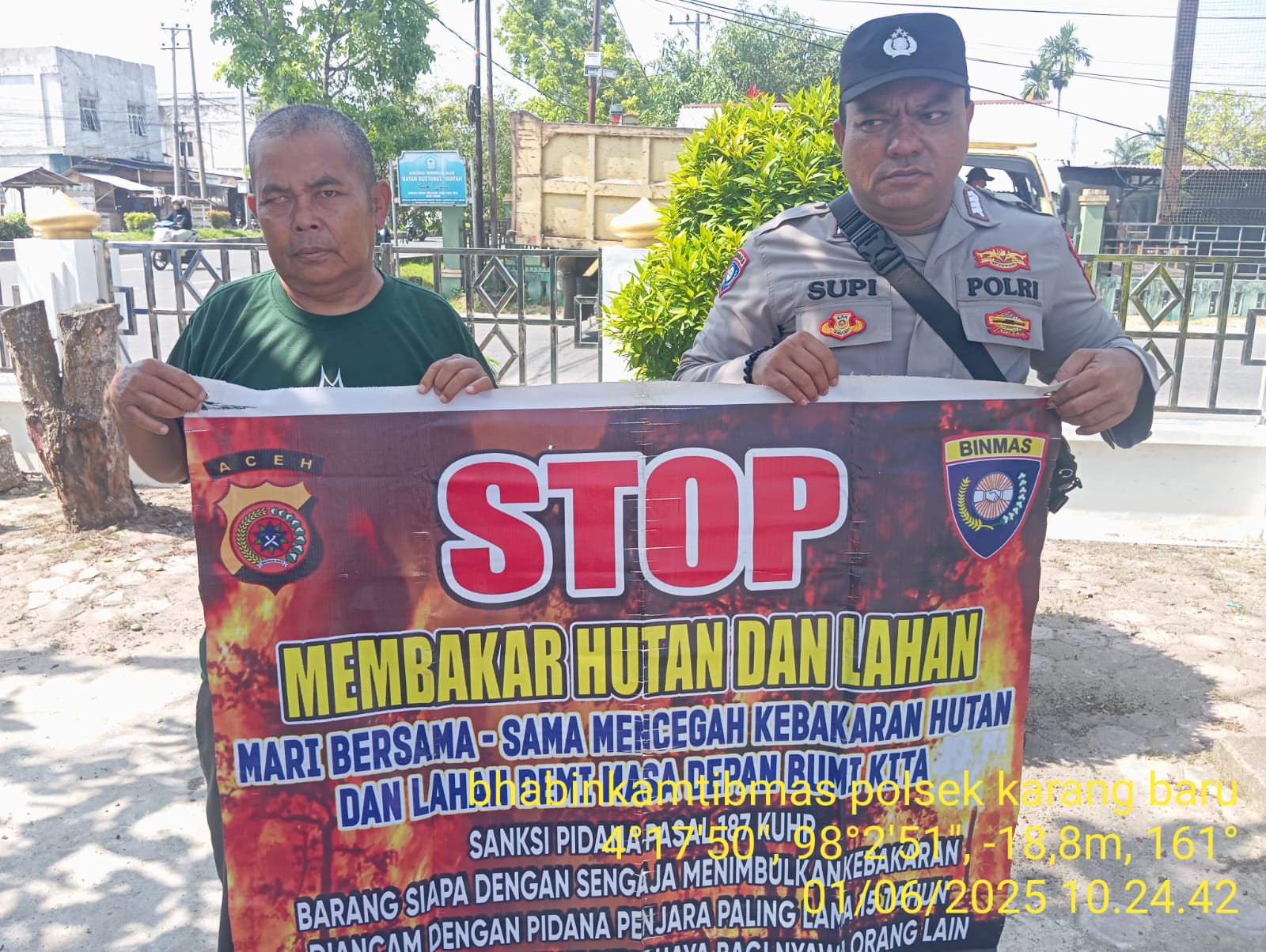 ACEH TAMIANG – Polda Aceh, Polres Aceh Tamiang melalui Personil Polsek Karang Baru melakukan Patroli sekaligus menyampaikan sosialisasi bahayanya melakukan pembakaran dalam rangka pencegahan dan himbauan terkait kebakaran hutan dan lahan (Karhutla). Minggu (1/06/2025).