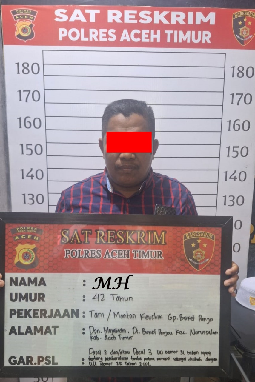 Aceh Timur | Mediaindonesia24. Mantan Geuchik (Kepala Desa) Gampong Buket Panjou, Kecamatan Nurussalam Kabupaten Aceh Timur, MH, 42 tahun ditetapkan sebagai tersangka oleh penyidik Satreskrim Polres Aceh Timur, Polda Aceh dengan dugaan melakukan tindak pidana korupsi atas Pengelolaan dan Pertanggungjawaban Anggaran Pendapatan Belanja Gampong (APBG).