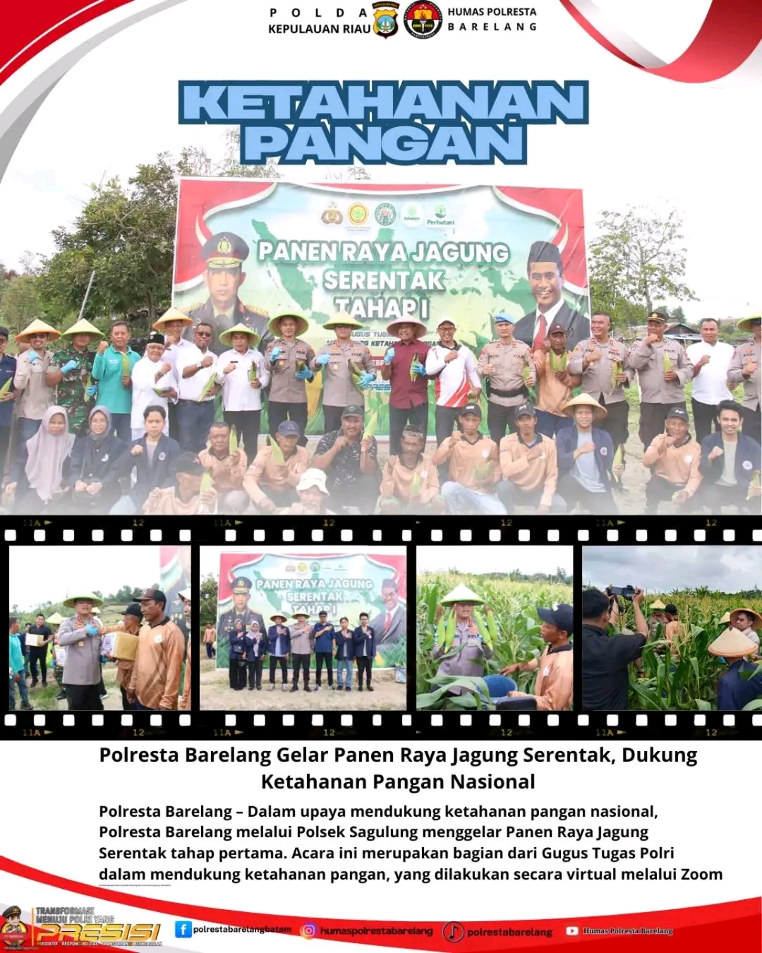 Kabartujuh.com || Polresta Barelang – Dalam upaya mendukung ketahanan pangan nasional, Polresta Barelang melalui Polsek Sagulung menggelar Panen Raya Jagung Serentak tahap pertama.