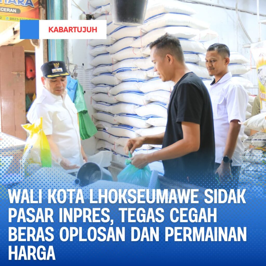 Lhokseumawe, 30 Juli 2025— Dalam upaya menjaga stabilitas harga dan mutu pangan, Pemerintah Kota Lhokseumawe melakukan inspeksi mendadak (sidak) ke Pasar Inpres pada Rabu pagi (30/7). Sidak dipimpin langsung oleh Wali Kota Lhokseumawe, didampingi Plt. Sekda, Kepala Perum Bulog Cabang Lhokseumawe, Kepala Dinas Perindagkop dan UKM, serta jajaran dinas terkait lainnya.
